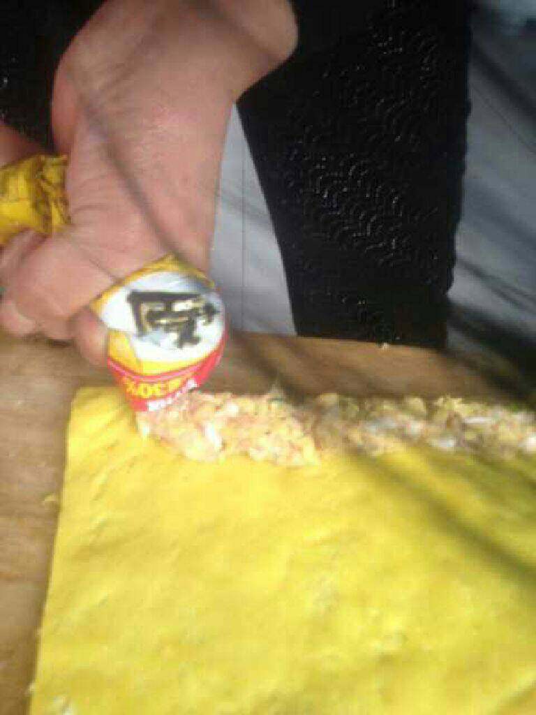 9. 用大饹馇卷上肉馅,卷两圈,边缘用面糊封好。