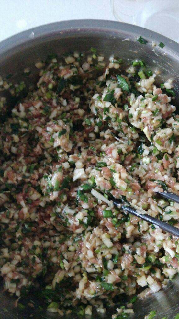 5. 将拌好的猪肉馅放入,加入盐搅拌均匀,如果这个过程觉得油或者酱油少可以再放一些
