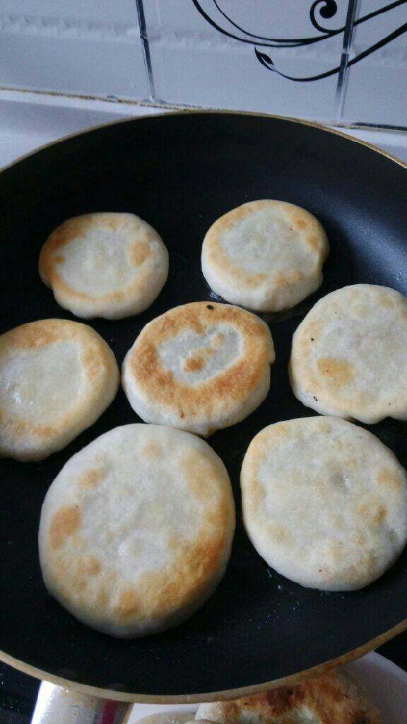 8. 包好后,平底锅放少量油开始烙馅饼