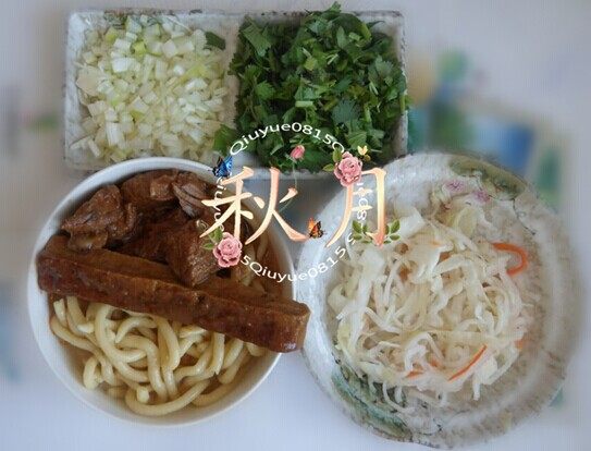 11. 好了,盛碗啦。牛肉豆腐干卤、葱花、香菜、腌小菜、大蒜、辣椒油、醋醋醋……哈哈