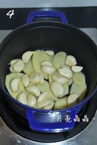 4. 取一个砂锅或者保温性能好的锅子(我用的是珐琅铸铁锅),把姜和大蒜粒铺满锅底,再倒入三汤匙左右食用油(能铺满整个锅底的量就可以)