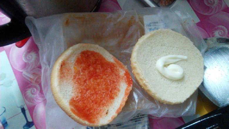 6. 汉堡包胚一面涂上番茄酱一面涂上沙拉酱涂均匀了