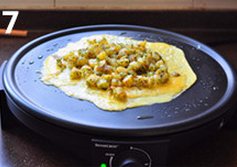 7. 趁蛋液未凝固时,平摊上炒好的土豆