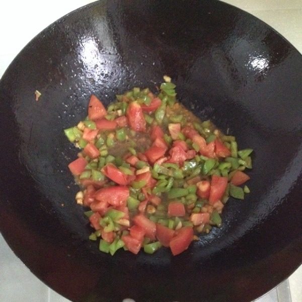 7. 将茄子出锅,锅内留底油,油热后放入大蒜粒爆香后,依次放入菜椒丁、番茄丁。