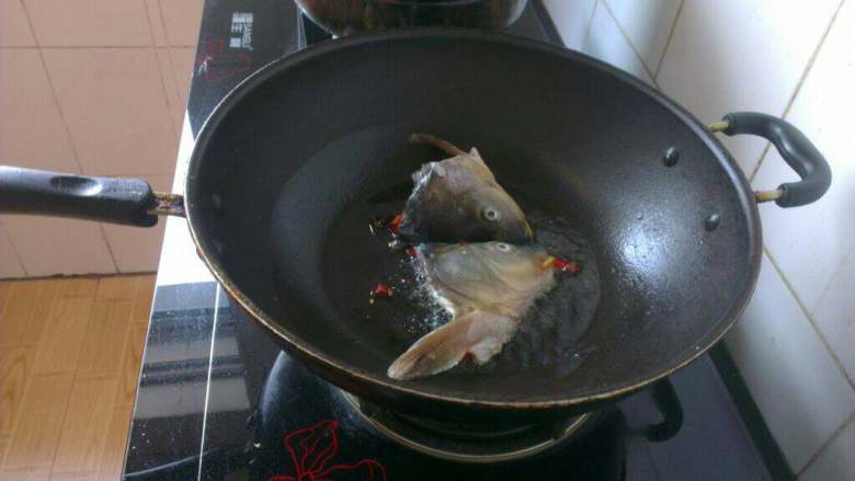 2. 炒锅倒油烧热,放入两半鱼头煎至两面变色;