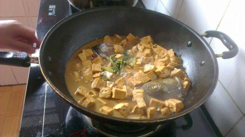 5. 放入豆腐块儿加少许盐 鸡精 和胡椒粉调味儿炖半小时;