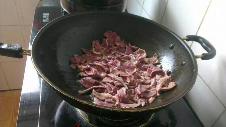 2. 炒锅放油烧热,倒入猪心片儿翻炒片刻;
