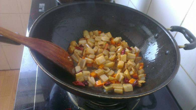 6. 倒入炸熟的胡萝卜丁儿和藕丁翻炒几下;