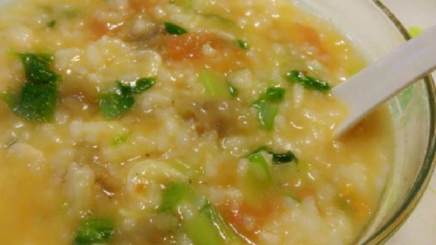 7. 煮到汤饭变浓稠时,加入虾皮和青菜一起煮一两分钟。。