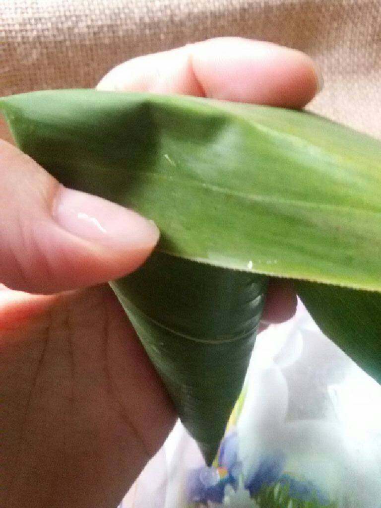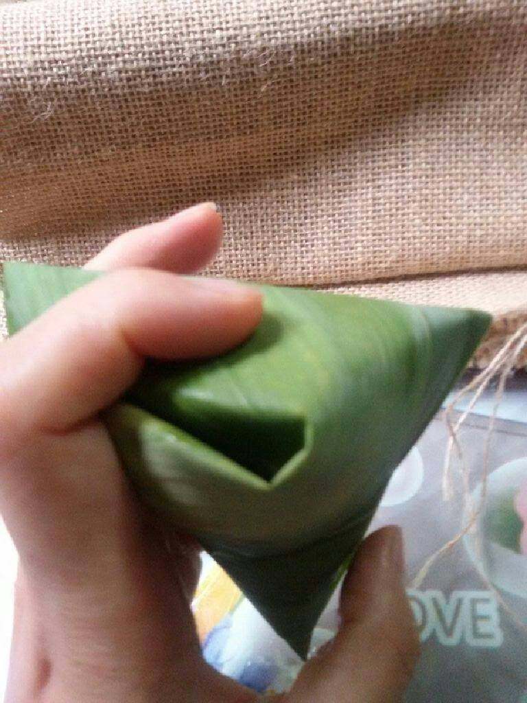 11. 把多余的粽叶顺着折叠,包裹成三角形。