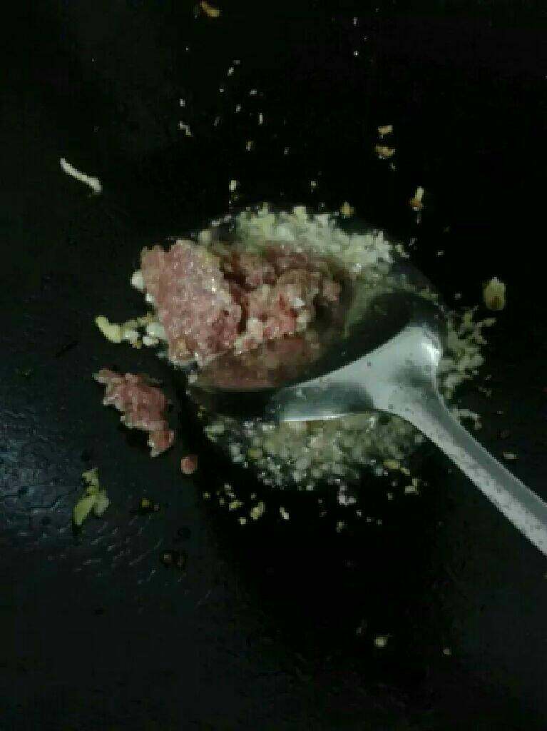 7. 放入腌制好的牛肉末爆炒