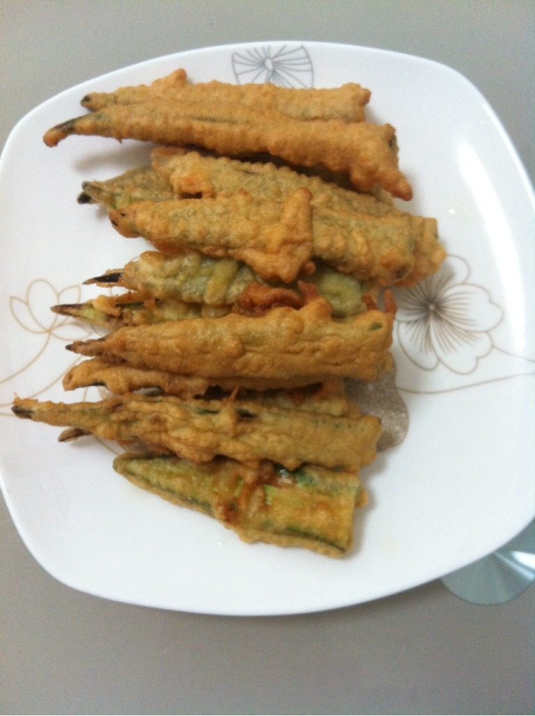 4. 锅内加油,油热后将挂面糊的秋葵下油锅