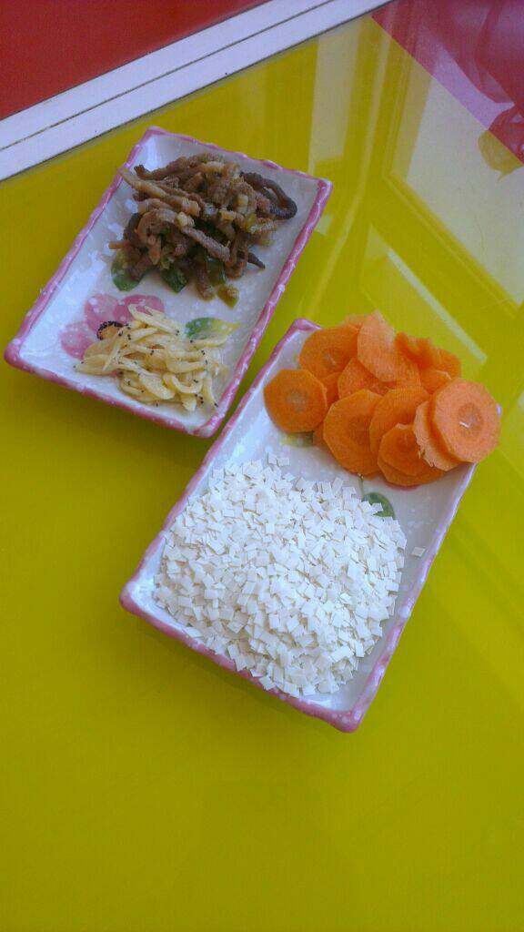 2. 小锅内添适量水,放入胡萝卜片儿和肉丝煮开;
