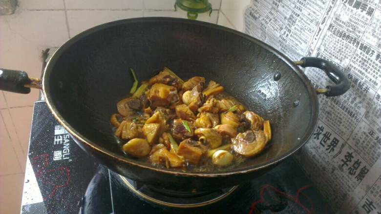 4. 倒入焯烫好的的鸡块儿加适量料酒翻炒几下;