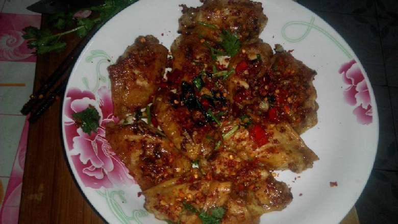 6. 煎一面金黄翻过来煎另一面,这个时候放入辣椒和蒜末