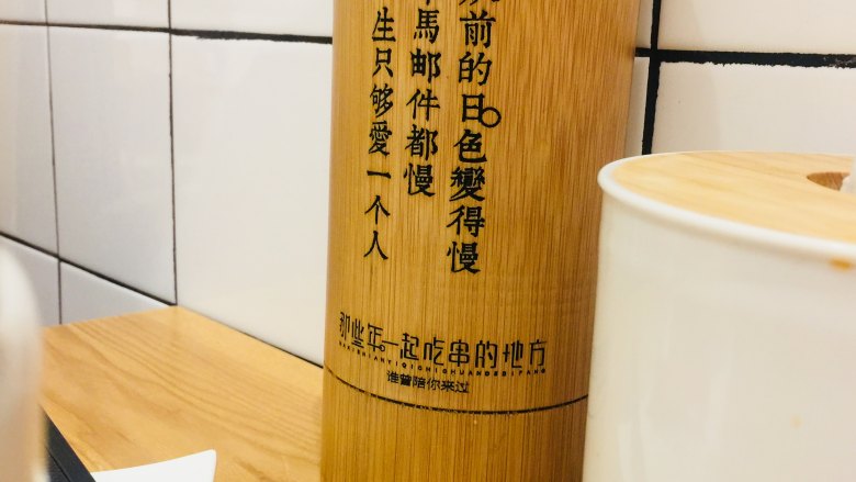 位置:📍乐桥地铁站6号口附近,路口有全家的那个巷子进去就能看见 环境:🍃很清新的烧烤店,装潢比较简约个性,墙面上、碟盘上的文字也尽显文艺气息,就像上图👆的“声声慢”中的文字很有想法内涵💗整体色调整洁明亮,心情会变好呀😹
